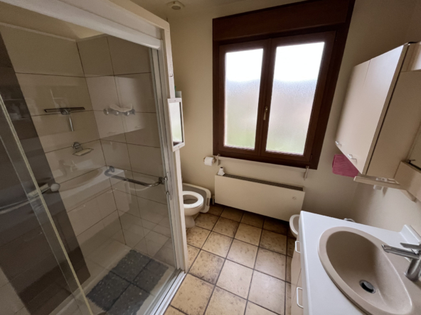 À l’étage, un palier dessert une chambre supplémentaire, une salle de bains avec WC ainsi qu’un grenier offrant un espace de rangement appréciable.