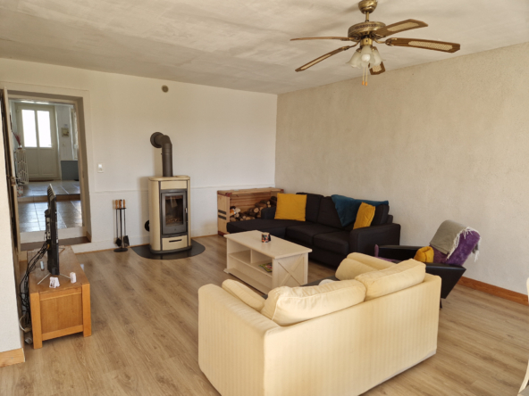 Le séjour lumineux de 52 m2 avec son poêle a bois permet d’accueillir des amis ou la famille pour des repas.