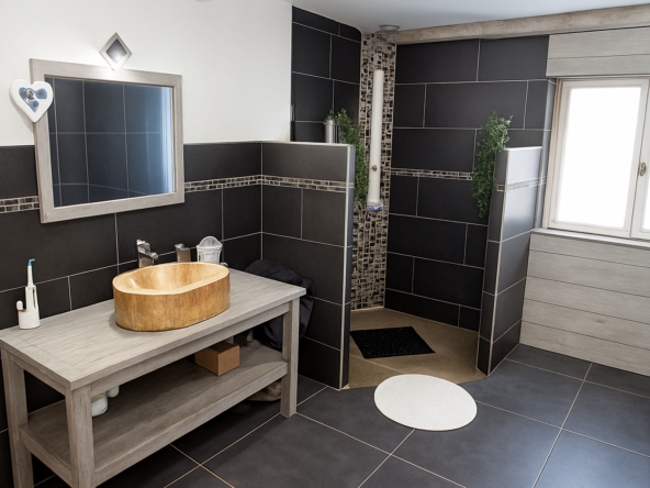 Maison atypique en pierre de 130 m2 habitable comprenant une entrée desservant le garage, une cuisine équipée, une salle de bain avec douche / baignoire / vasque / sèche serviette, un wc, un séjour et un escalier qui mène a 3 chambres.